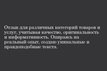 Я создаю отзывы для различных категорий товаров, учитывая качество, оригинальность и информативность. Опираясь на реальный опыт, создаю уникальные и правдоподобные текста.