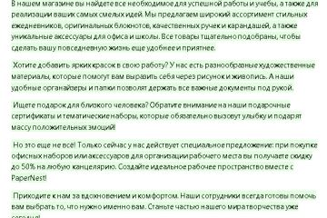 Я всегда стараюсь учитывать особенности вашего бренда и целевой аудитории, чтобы создать текст, который будет максимально эффективным. В работе я использую креативный подход, но при этом не забываю о важности ясности и понятности сообщения.