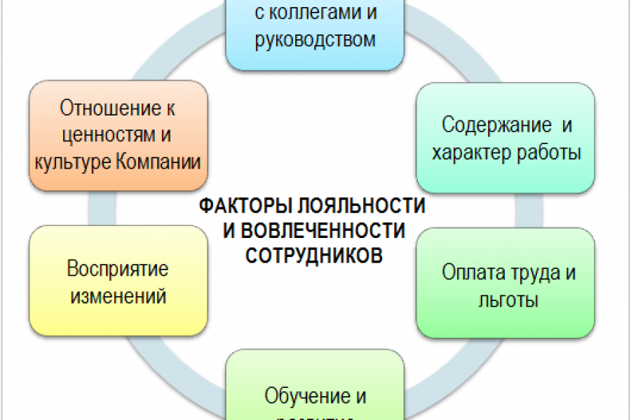 По результатам сравнительных исследований мы выделили 6 ключевых факторов, влияющих на удовлетворенность, вовлеченность и лояльность сотрудников организации: