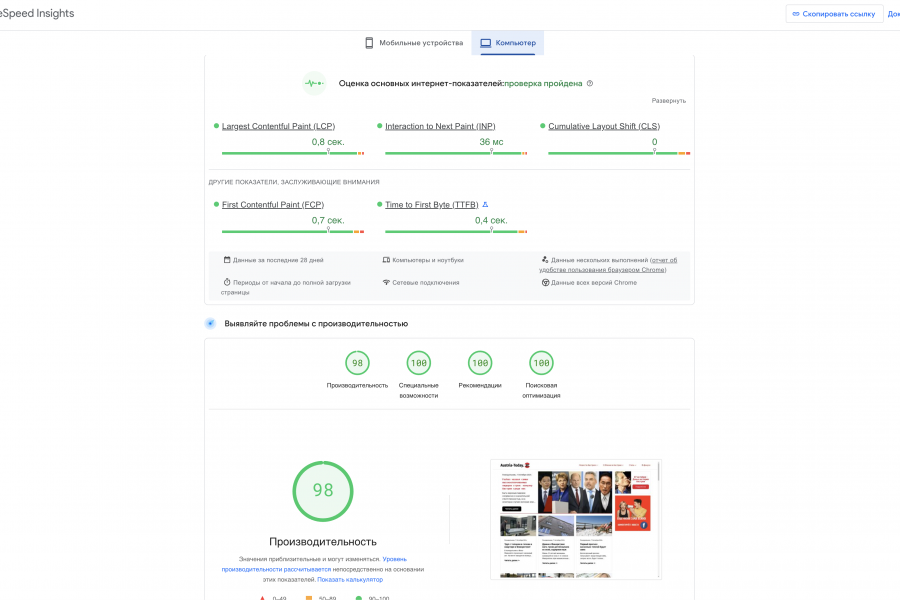 Оптимизация вашего сайта по Google PageSpeed Insights. Степень оптимизации зависит от технологий на которых реализован сайт и может отличаться от случая к случаю.