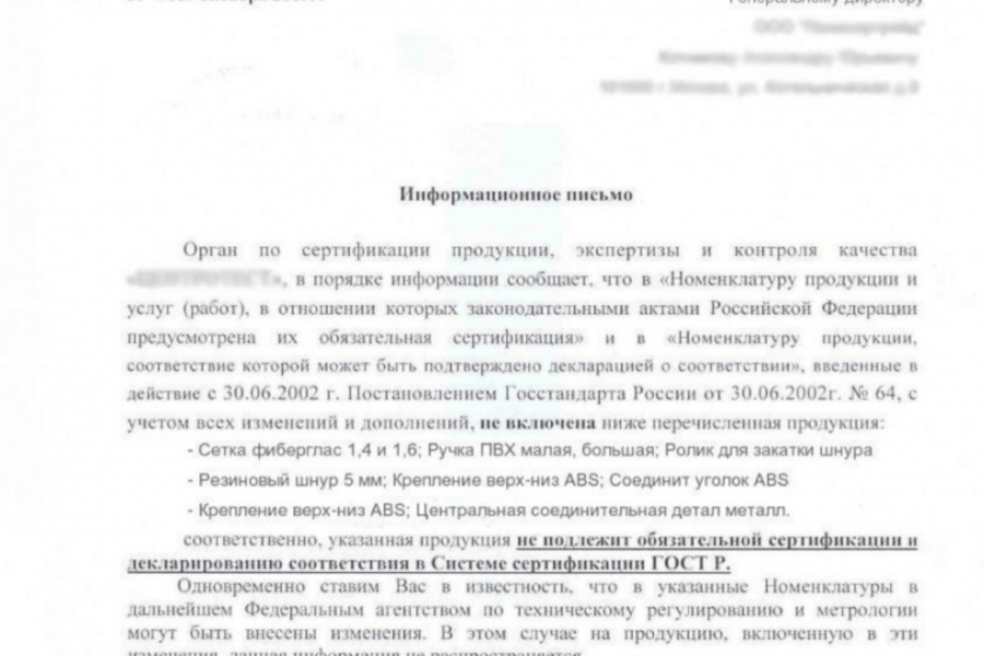 Оформлю отказное письмо от органа по сертификации на Вашу продукцию