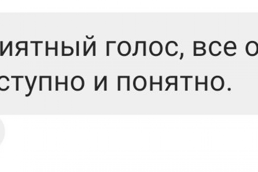 Всю жизнь слышу от всех: « какой приятный голос!» Начиная от клиентов и знакомых, заканчивая совершенно незнакомыми людьми))) Рассмотрю любые виды озвучки: видео, медитации, аудиоформаты, голосовые сообщения и тд