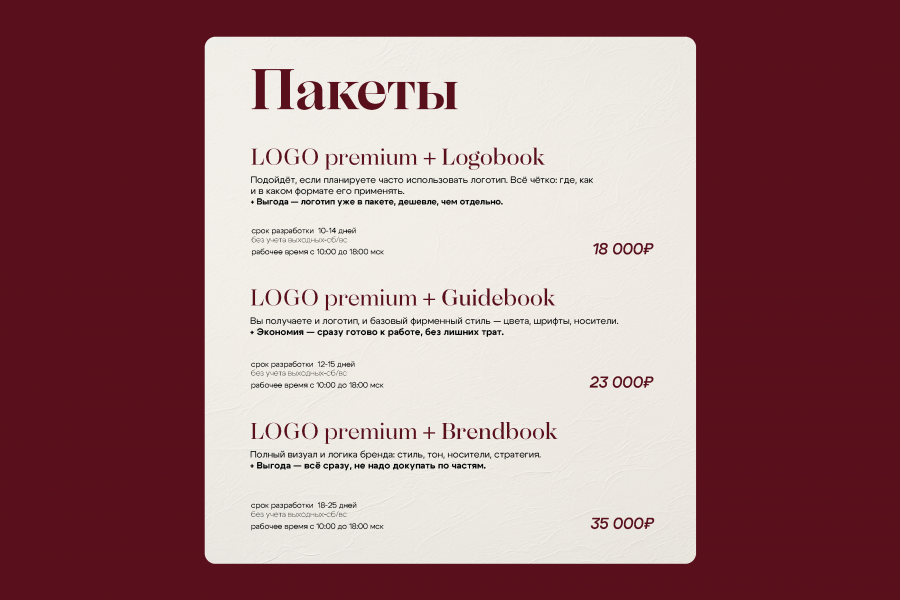 Пакеты — это выгодное решение: вы получаете не только логотип Премиум-уровня, но и нужную документацию под задачи вашего бренда — логобук, гайдбук или брендбук. Это дешевле, чем заказывать всё отдельно, и вы сразу получаете качественную, готовую к применению визуальную систему.