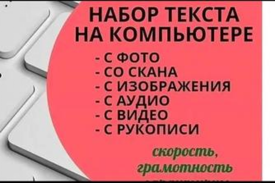 Перепечатка текстов, которая включает в себя: печать текста с отсканированных документов; печать текста с книжных носителей; ввод цифровой и текстовой информации с отсканированных документов, сверка после внесения правок, набор информации с предоставленных графических файлов в текстовый документ.