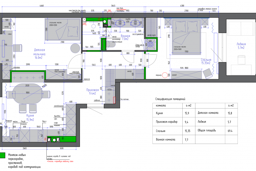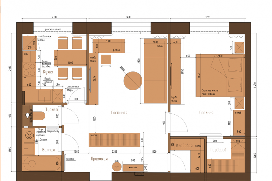Планировка отрисовывается на основе, заполненного брифа с указанием необходимой мебели, оборудования, техники, и особенностей необходимых для человека индивидуально.