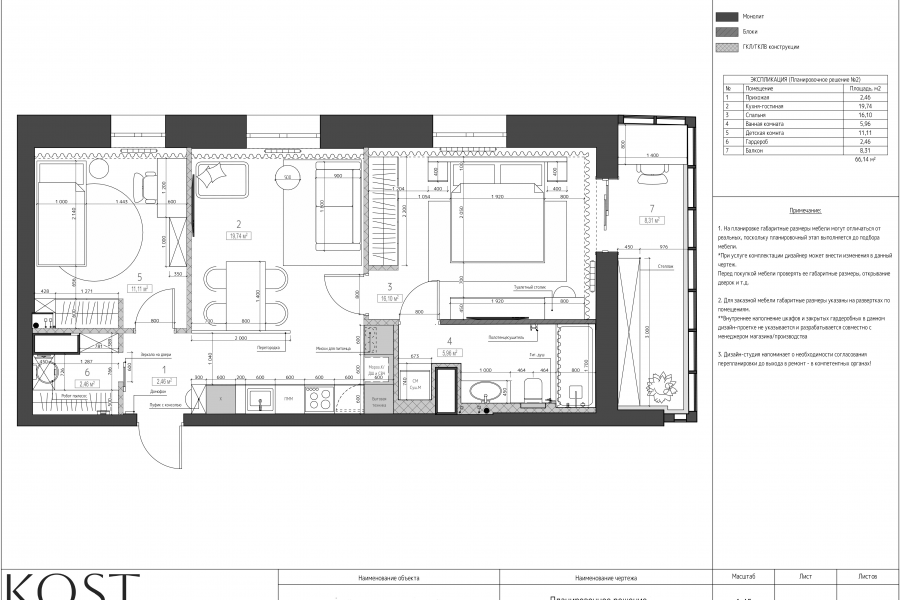 — 2–3 варианта планировки с зонированием и мебелью в реальных габаритах;