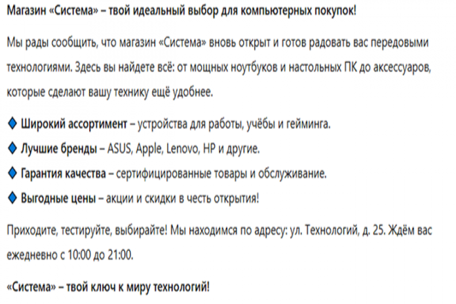 - Контент для сайтов: статьи, описания товаров, лендинги.