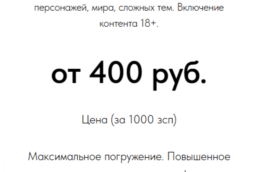 Детальное написание, глубокая проработка персонажей, мира, сложных тем. Включение контента 18+.