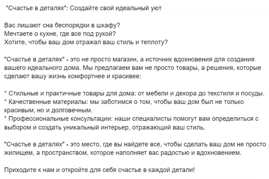 - Написание продающих текстов: для сайтов, рекламных материалов, постов в соцсетях, описаний товаров и услуг.
