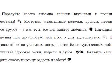 В этом проекте я разработала рекламный текст для продвижения лакомств для домашних животных. Моя цель была создать дружелюбное и вдохновляющее сообщение, которое привлекло бы внимание владельцев питомцев. В тексте я подчеркнула натуральный состав продукции и её пользу для здоровья, а также предложила лакомства как идеальный вариант для поощрения и удовольствия. Я использовала эмоциональные акценты и эмодзи, чтобы сделать текст более визуально привлекательным и личным, помогая установить связь с целевой аудиторией. Этот подход сделал сообщение более живым и убедительным.