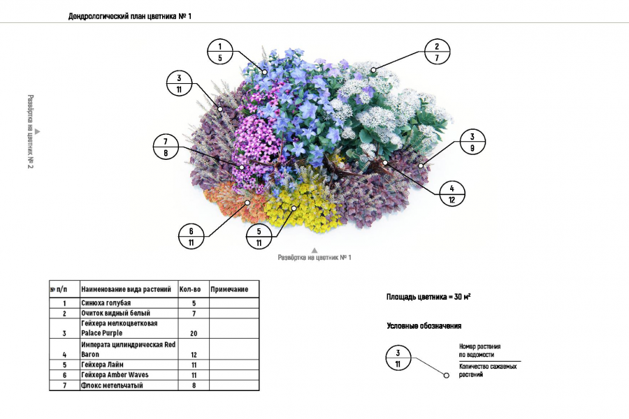 Разработка проекта декоративных композиций из деревьев и кустарников, цветников для всего участка с разбивкой и посадочной ведомостью.