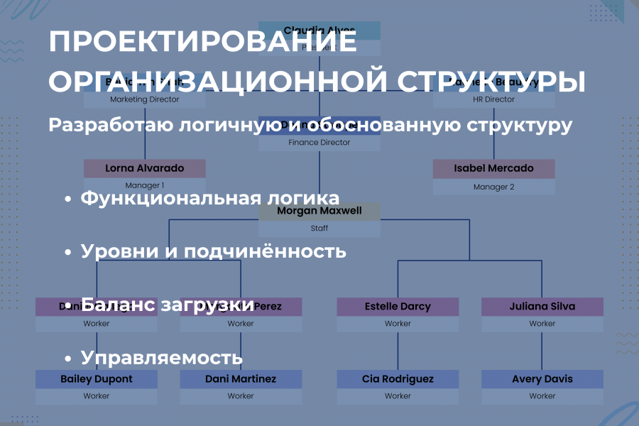 Разрабатываю оргструктуру, соответствующую бизнес-процессам и стратегии компании. Определяю уровни управления, подчинённость, функции и зоны ответственности.