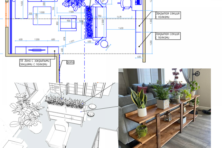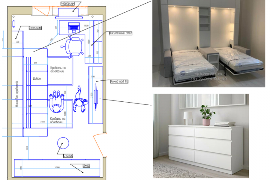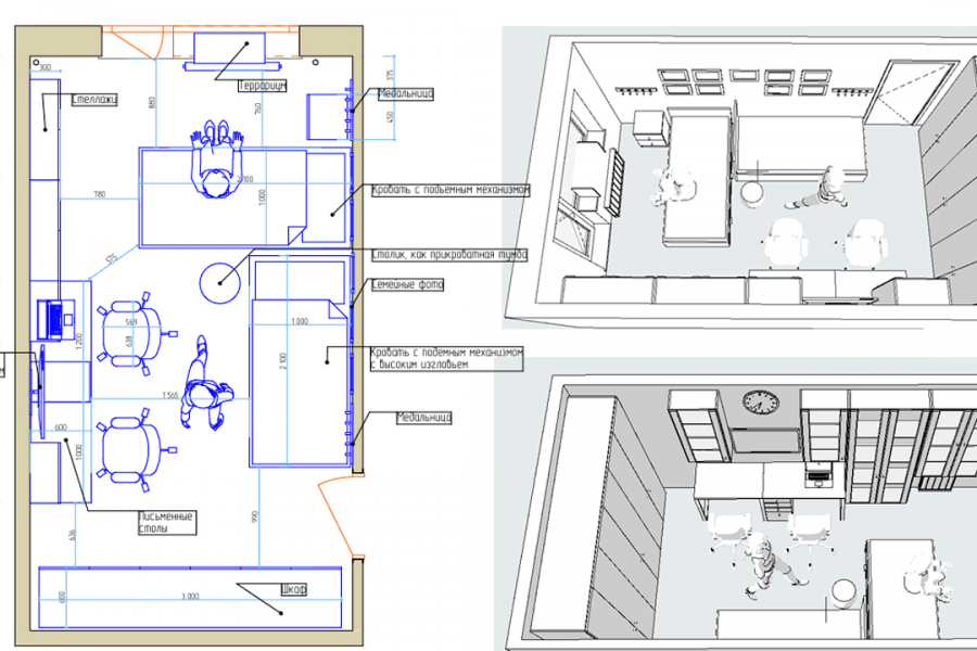 - план расстановки мебели (2-3 варианта) с указанием размеров мебели и проходов между ней