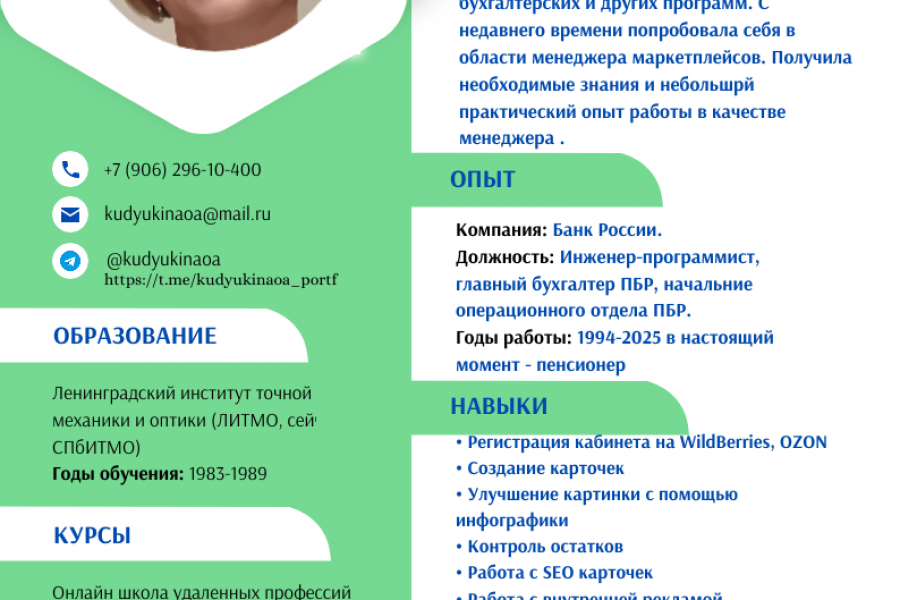 Добрый день! Меня зовут Ольга. Я начинающий менеджер по маркетплейсам. Имею большое желание развиваться в данном направлении. В прошлом, работая в банке, имела большой опыт работы с различными компьютерными программами (1:С, Ecxel, Word, почтовые сервисы, криптографические программы и т.д.). Имею большой опыт работы с деловой перепиской, договорами, распорядительными документами. Освоила необходимые для Вас навыки: