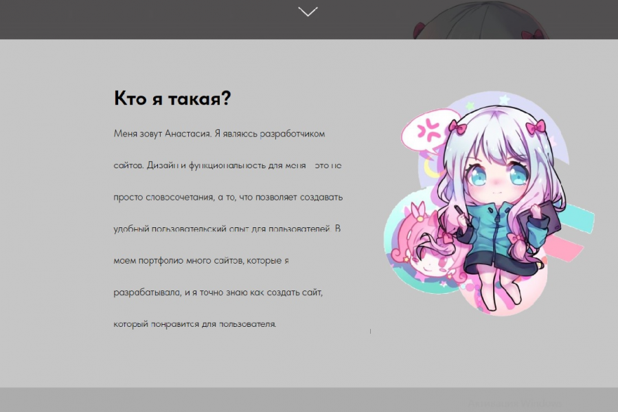 Меня зовут Анастасия. Я занимаюсь разработкой сайтов. Дизайн и функциональность для меня - это не просто словосочетания, а то, что позволяет создавать удобный пользовательский опыт для пользователей.
