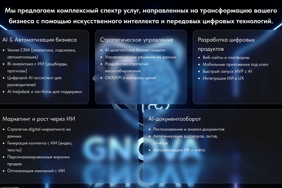 Мы — команда разработчиков и архитекторов, которая превращает бизнес-идеи в высокотехнологичные цифровые продукты. Мы объединяем классический софт (Web, Mobile, CRM) с мощью искусственного интеллекта, чтобы ваш бизнес работал быстрее и эффективнее конкурентов.