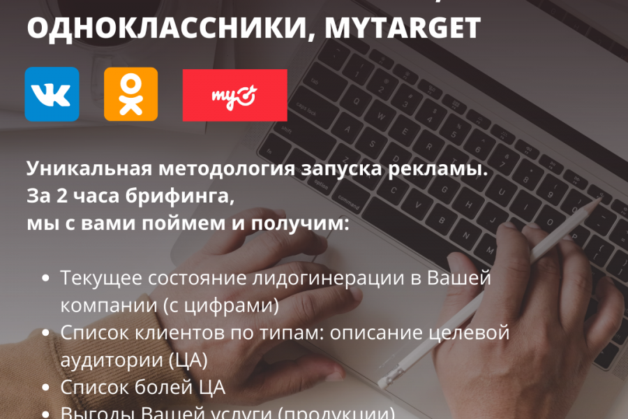 Есть своя уникальная методология запуска рекламы. За 2 часа брифинга, мы с вами поймем и получим: