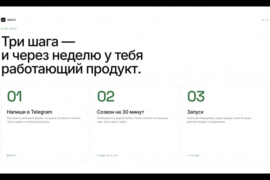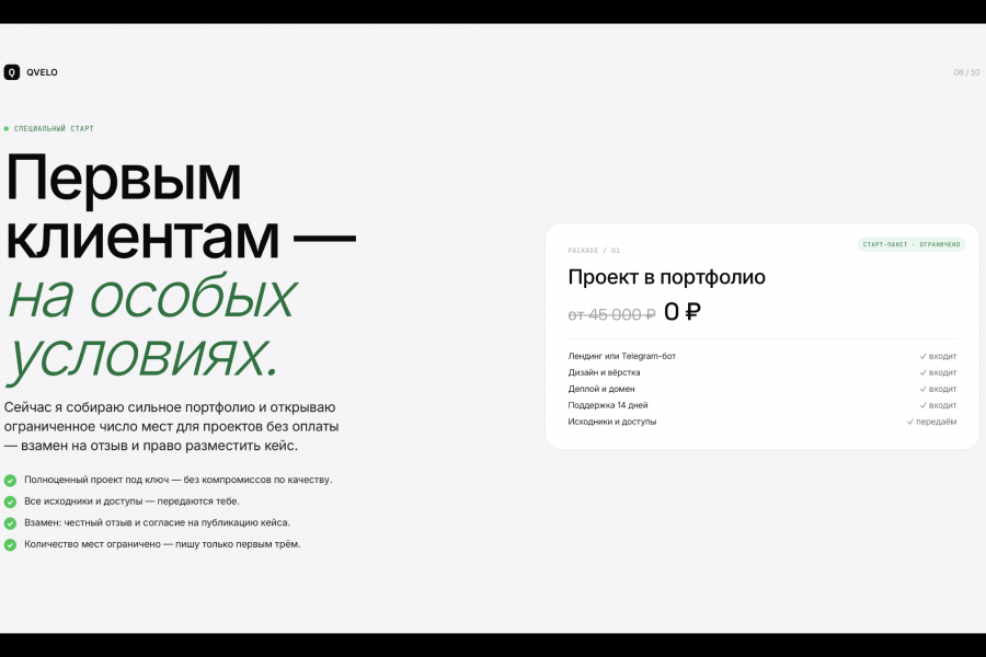 Вы получаете полноценный рабочий продукт, я — отзыв и право разместить результат в портфолио.