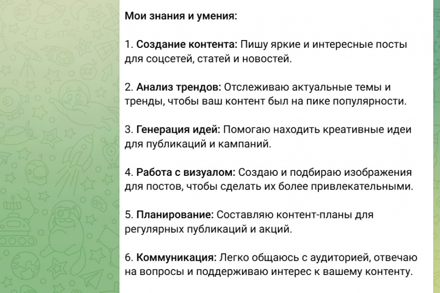 Создам интеллектуального Telegram-бота, который ведёт диалог, обучает или консультирует. Возможные варианты: бот-инструктор, бот-нутрициолог (психолог), SMM-бот (ведение канала в телеграмм, написание текстов, создание контента, марафонов и многое другое ), бот для бизнеса с подключением базы знаний (сайт, FAQ, документы) и другие ваши пожелания.