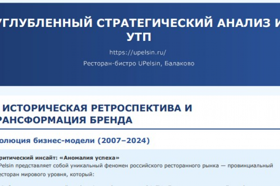 1. Провожу аудит уникального торгового предложения: анализирую конкурентное окружение, цифровое присутствие сайта и соцсетей, выявляю критические проблемы, воронки продаж. Исследую целевую аудиторию — сегментацию, поведенческие паттерны, барьеры выбора.