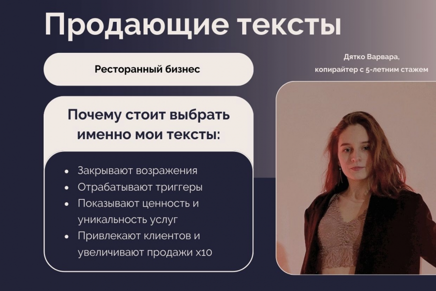 Я профессиональный копирайтер с 5-летним опытом создания рекламных текстов для ресторанного бизнеса помогу вам с созданием высокоэффективной рекламы.