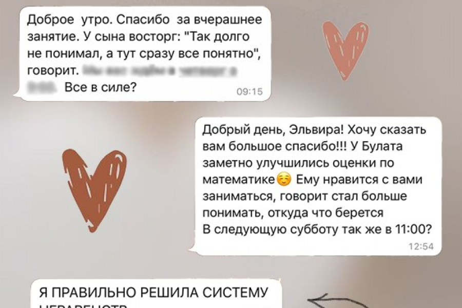 Вы можете больше не волноваться за успеваемость Вашего ребёнка. Я помогу вывести его знания на новый уровень, подробно объяснив тему и решение каждого задания. В работе стараюсь найти индивидуальный подход к каждому ученику и использовать различные методики обучения, ведь как известно, каждый ребенок по-разному воспринимает информацию.