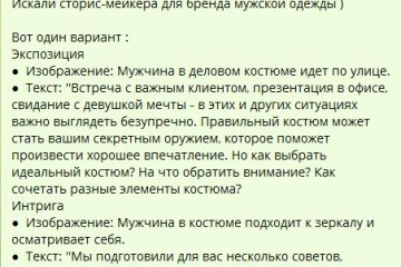 Напишу сценарии для ваших рилс/сторис ) . От вас - информация о главном герое/товаре, его потребности,о целевой аудитории, месте/времени события.