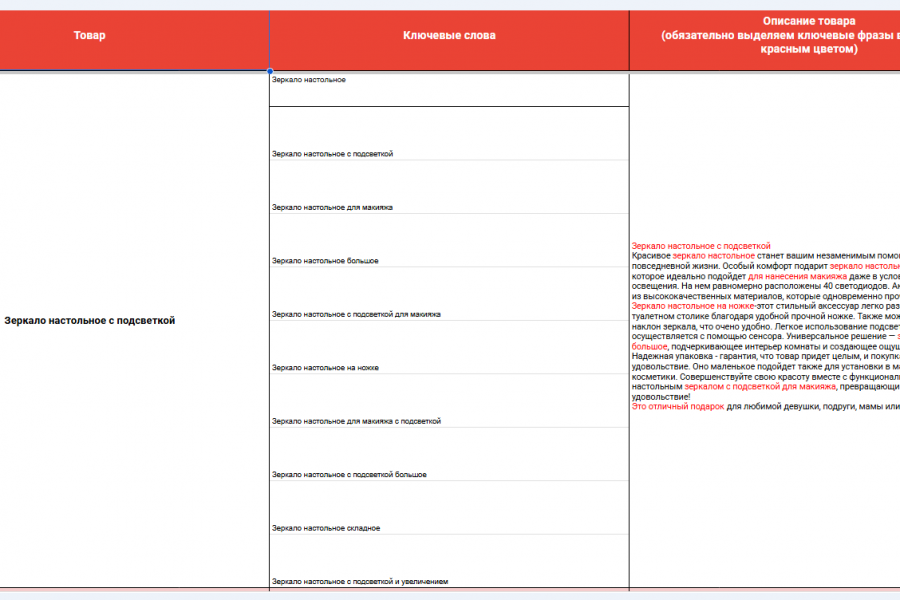 Что входит в услугу: Исследование ключевых слов, анализ конкурентов, создание структуры описания, использование ключевых слов, применение уникальных особенностей вашего товара, проверка и редактирование.