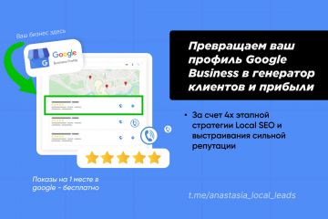 SEO оптимизация профиля Google Business. Входит: правильная настройка всех полей профиля, создание контента с ключевыми словами и оптимизации всех разделов профиля (фото, услуги и описания услуг, апдейты, FAQ, ответы на отзывы).