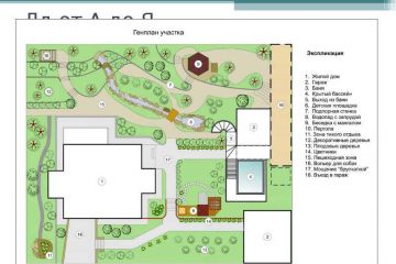 Размещение всех растений на чертеже; всех типов мощения; всех построек.