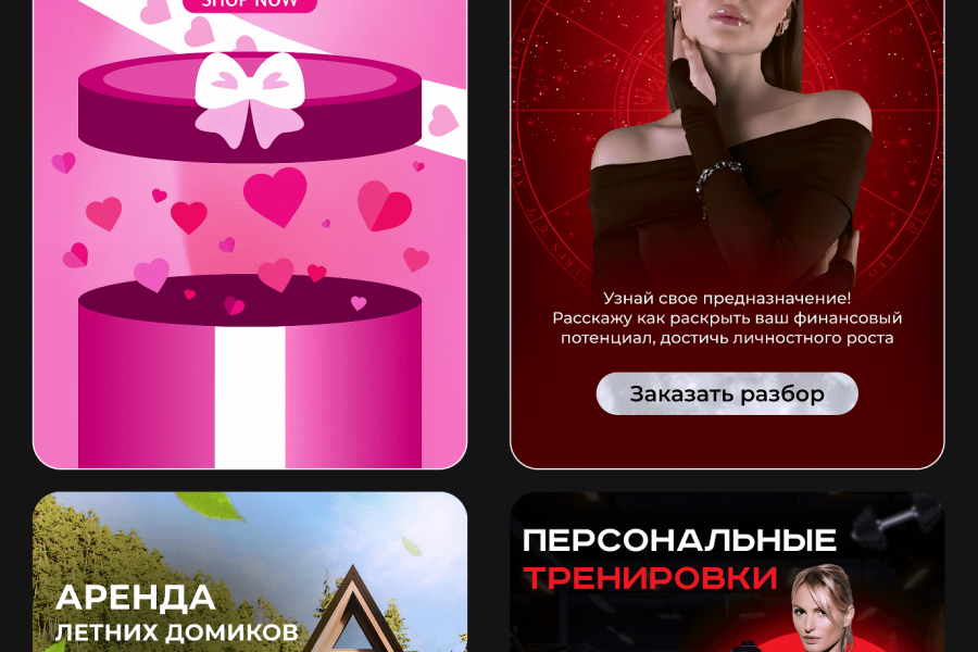 Разработаю стильные и продуманные баннеры для сайтов, социальных сетей и рекламных кампаний. Дизайн будет не только привлекательным, но и работающим на вашу цель — привлекать внимание, доносить информацию и вызывать нужные эмоции у аудитории.