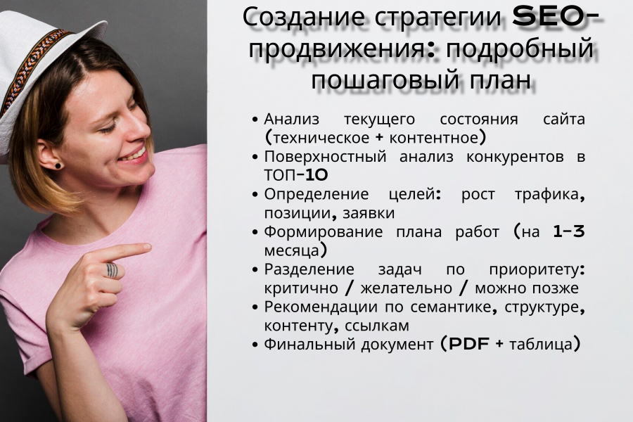 Я разработаю для вас индивидуальную SEO-стратегию на 1–3 месяца, с учётом ниши, конкурентов и текущего состояния сайта. Вы получите готовый план, по которому можно идти к результату.