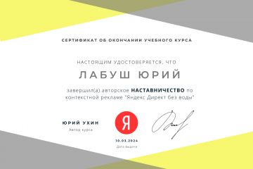 Привет! Меня зовут Юрий и я специалист по настройке Яндекс Директ на продвинутом уровне. Я успешно прошел курсы по Яндекс Директ без воды у Юрия Ухина и получил диплом о наставничестве.