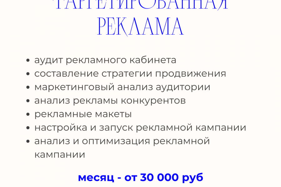 аудит рекламного кабинета составление стратегии продвижения маркетинговый анализ аудитории анализ рекламы конкурентов рекламные макеты настройка и запуск рекламной кампании анализ и оптимизация рекламной кампании
