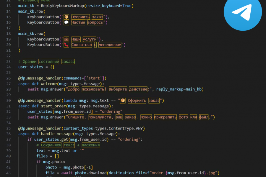 🔧 Пример фрагмента кода Telegram-бота, который вы получите при заказе