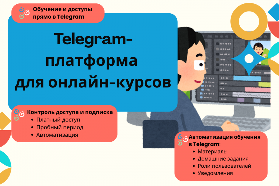 Решение позволяет организовать обучение и управление доступом прямо в Telegram — без сайтов, LMS и сложных панелей управления.