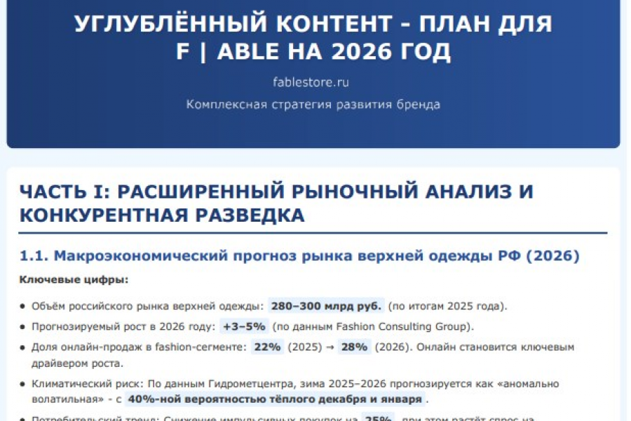 Включу: конкурентный анализ с GRID-матрицей, сезонное планирование с учетом погодных трендов, мультиплатформенную стратегию (ВК, TG, UGC), финансовые модели с расчетом ROMI, кризисные сценарии с Планом "Б".