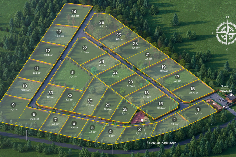 1) Эффектные рендеры, демонстрирующие планировку поселка, гармонию архитектуры и ландшафта.