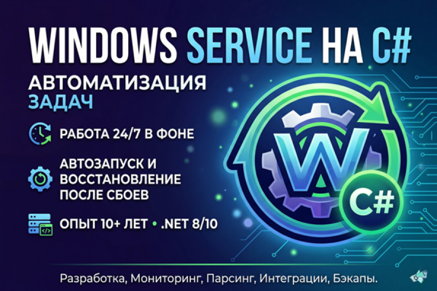 Разработаю Windows Service на C# для автоматизации задач, которые должны работать в фоне 24/7 — без участия пользователя, с автозапуском и восстановлением после сбоев.