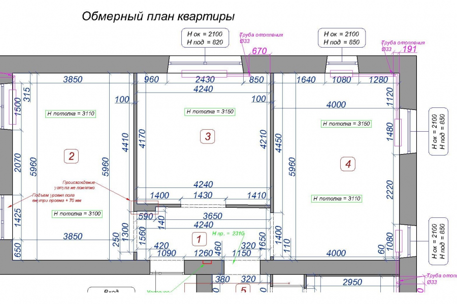 - обмерный план в оцифрованной формате DWG и РDF со всеми необходимыми размерами, коммуникациями;