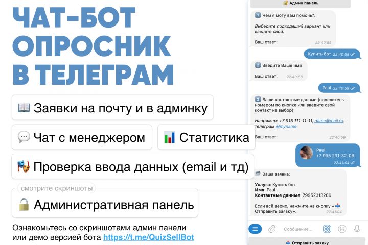 Приветствую! Представляю вашему вниманию чат-бот опросник в телеграм. Он поможет вам собирать заявки от пользователей прямо в Telegram и получать их моментально в админку (с уведомлением) и на вашу электронную почту.