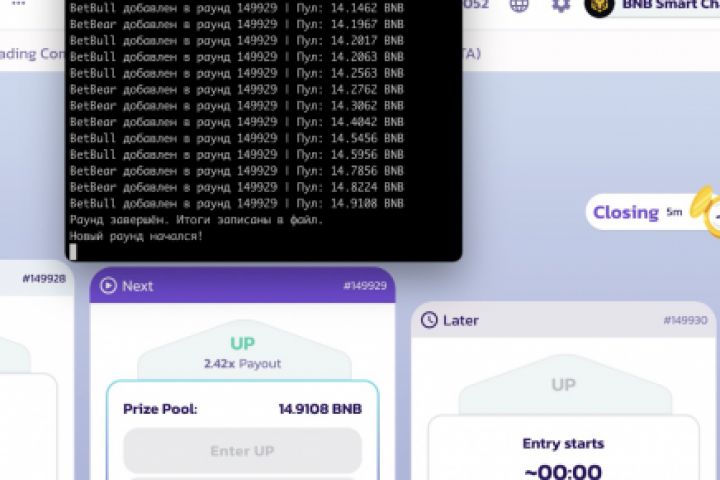 Sniper бот для Prediction Pancakeswap. Залетает на последней секунде и попадает в блок точь в точь перед самым закрытием, учитывает суммы пулов (смотрит на мемпул и обработанные транзакции), считает кэф и принимает решение.
