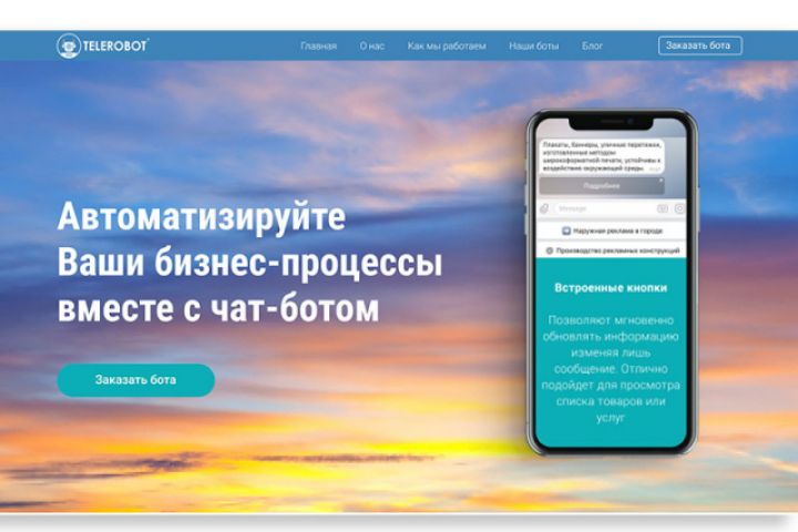 Разработка Landing Page для рекламного агенства, которое занимается предоставлением услуг по разработке чат-ботов Телеграм. Акцент сделан на выгоде и экономии при использовании этой услуги.