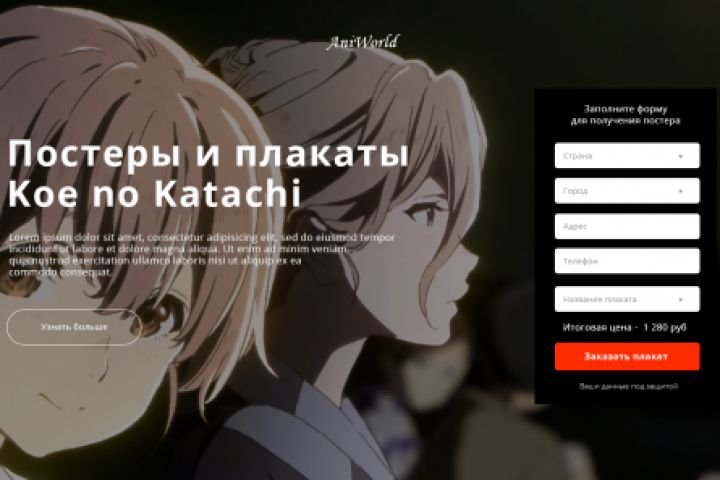 Первый экран сайта по продаже постеров и плакатов из аниме Koe No Katachi (Shape of Voice / Форма Голоса), с добавленной формой захвата для оперативного заказа интересующих плакатов и постеров (экран выполнен в 12 колонках)