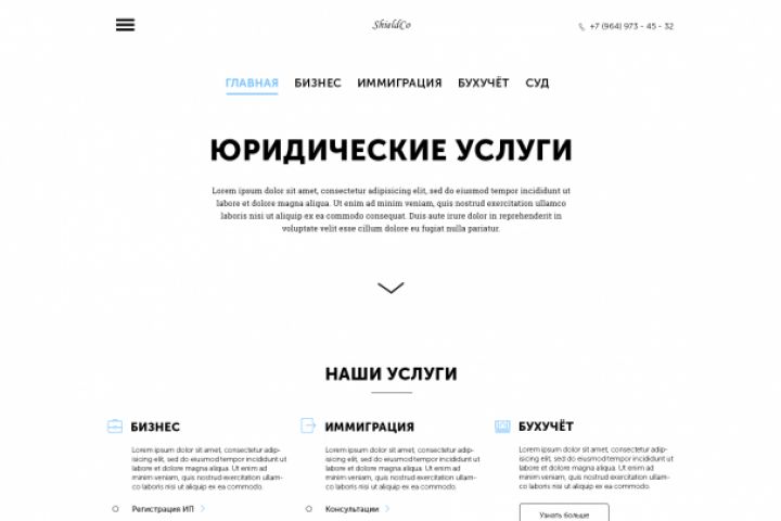 Сайт юридической компании ShieldCo. Дизайн выполнен в сдержанном стиле, что соответствует тематике сайта, но макет не лишён стиля и выглядит "аппетитно")