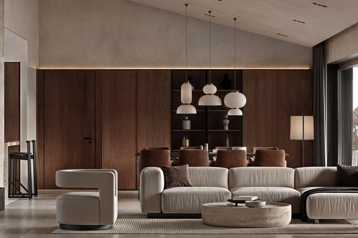 Текстурный минимализм: Мы отказались от декора в пользу богатства фактур. Натуральный камень у камина, шпон дуба и фактурная штукатурка дают визуальную насыщенность без лишнего шума.