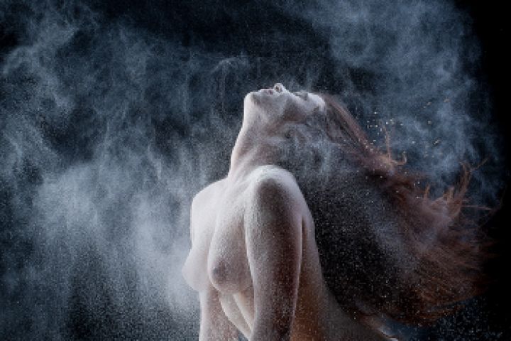 Девушка делает взмах волосами испачканными в муке. Заморозка движения генератором Broncolor.
