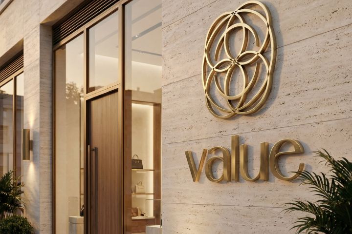 Концепция логотипа ювелирного магазина value строится на сочетании геометрической утончённости и смысла «ценности». Знак выполнен из пересекающихся золотых дуг, напоминающих одновременно грани драгоценного камня, переплетение колец и ювелирную филигрань. Многократные пересечения создают ощущение объёма и «сияния» — как игра света на металле и камнях.