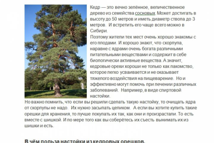Информационная статья о пользе кедровых орехов, с описанием рецептов приготовления настойки из них.