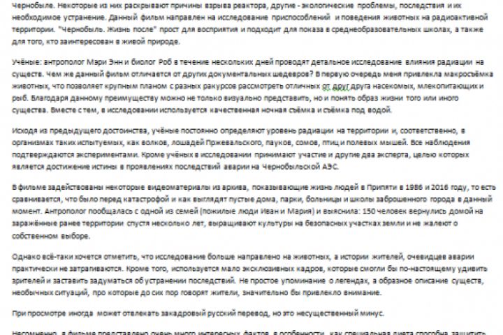 Отзыв представляет собой выявление достоинств и недостатков в детальном исследовании фильма "Чернобыль.Жизнь после" спустя 30 лет после аварии на АЭС.